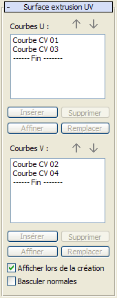 Lorsque vous cliquez sur les courbes, leur nom s'affiche dans les listes du panneau déroulant Création de surface d'extrusion UV. L’ordre de sélection des courbes peut affecter la forme de la surface extrusion UV.