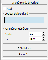 - Cliquez sur ce bouton pour ouvrir la boîte de dialogue Environnement et effets ; dans le panneau déroulant Paramètres brouillard, vous pouvez ajuster l'effet Brouillard de façon plus détaillée.
