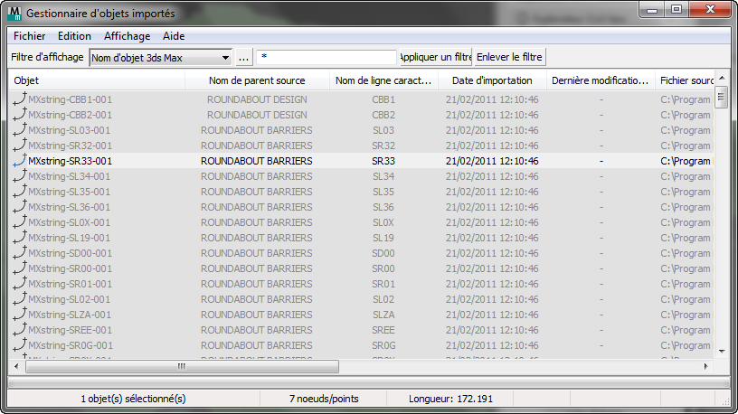 Vous permet d'afficher et gérer les objets que vous avez importés comme données de génie civil.