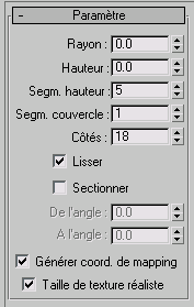 Les paramètres par défaut génèrent un cylindre lisse à 18 côtés dont le point de pivot se situe au centre de sa base. Il comporte cinq segments hauteur et un segment couvercle. Si vous n’avez pas l'intention de modifier la forme du cylindre (à l'aide du modificateur Courbure, par exemple), réglez le paramètre Segments hauteur sur 1 pour réduire la complexité de la scène. Si vous envisagez de modifier les extrémités du cylindre, augmentez la valeur du paramètre Segm. couvercle.