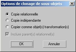 Lorsque vous appuyez sur Maj+Cloner un sous-objet surface ou courbe, la boîte de dialogue Options de clonage s'affiche, vous permettant de créer une copie relationnelle, une copie indépendante ou un objet transformation.