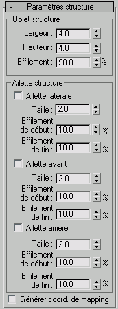 Utilisez les cases à cocher pour activer ou désactiver les ailettes sur les côtés de la structure et les paramètres numériques permettant de contrôler la taille des ailettes et les paramètres d'effilement.