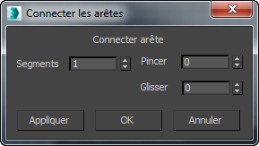 La connexion d'arêtes crée des arêtes entre des paires d'arêtes adjacentes sélectionnées. Les paramètres Connecter les arêtes vous permettent d'indiquer le nombre de nouvelles arêtes, la distance les séparant et leur emplacement général.