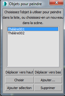La boîte de dialogue Peindre objets permet de gérer la liste des objets Peinture utilisés lors de la peinture d'objets dans la scène. Vous pouvez laisser cette boîte de dialogue ouverte lors de la peinture afin de modifier l'objet à la volée.