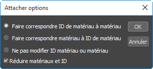 La boîte de dialogue Options attachement apparaît lorsque vous liez plusieurs objets auxquels différents matériaux ont été affectés. Elle propose trois méthodes différentes pour combiner les sous-matériaux et les ID de matériau dans les deux objets.