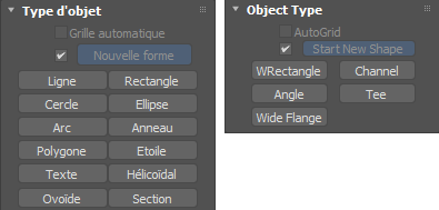 Une forme peut être constituée d'une ou de plusieurs splines (dans ce dernier cas, on parle de formes composées). Vous pouvez contrôler le nombre de splines d'une forme à l'aide du bouton Nouvelle forme et de la case à cocher du panneau déroulant Type d'objet.