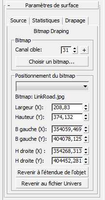 - Lorsque plusieurs jeux de coordonnées de drapage sont appliqués à l’objet surface sélectionné, veillez à utiliser la liste déroulante pour sélectionner le canal de matériau approprié avant de modifier les coordonnées de drapage affichées.