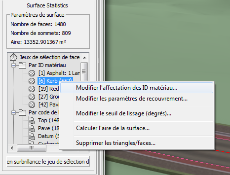 Pour les surfaces de projet 3D AutoCAD Civil 3D importées, un grand nombre de jeux de sélection de triangle/face renvoyant directement à la structure de projet 3D source s'affichent. Cela permet d'identifier des faces individuelles par nom de sous-ensemble, classe de sous-ensemble et code de lien d'origine.
