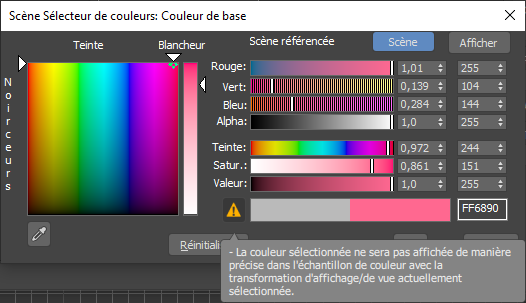 Lorsque vous utilisez la gestion des couleurs basée sur OCIO et que vous définissez les couleurs dans l’espace Scène, les glissières signalent les couleurs qui ne peuvent pas être reproduites dans votre affichage par des bandes noires. Vous pouvez sélectionner ces couleurs : la couleur la plus proche possible s’affichera à l’écran. De plus, vous pouvez placer le pointeur de la souris sur l’icône d’avertissement qui apparaît pour savoir si la couleur appartient à la gamme de couleurs de l’affichage, à la gamme de couleurs de rendu ou aux deux.