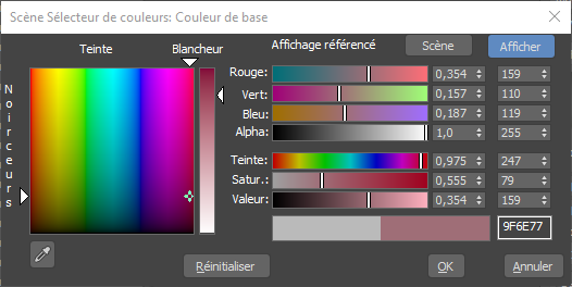 Utilisez le sélecteur de couleurs pour spécifier différents paramètres de couleurs, notamment les couleurs de la lumière, des matériaux, de l’arrière-plan ou les couleurs personnalisées d’un objet. Vous pouvez définir des valeurs dans l’espace de rendu ou dans l’espace d’affichage à l’aide de trois modèles de couleur différents pour vous aider à définir avec précision la couleur de votre choix.