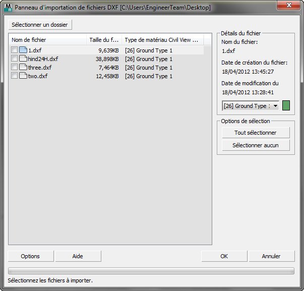 Permet d'importer simultanément dans Civil View les données de plusieurs fichiers DXF.