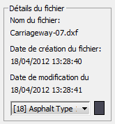 Par exemple, le canal de matériau 18 (Asphalte) sera appliqué aux surfaces contenues dans le fichier DXF nommé Carriageway1.dxf . Le canal de matériau Sol 27 type 2 sera appliqué aux surfaces figurant dans le fichier DXF nommé Ground1.dxf .