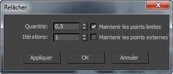 Utilisez ces paramètres pour relâcher des sommets en mode manipulation interactive. Relâcher dans Editer poly/Poly éditable fonctionne de manière similaire au modificateur Relâchement : il normalise la distance entre chaque sommet affecté et ses voisins en déplaçant le sommet vers la position moyenne de ses voisins.