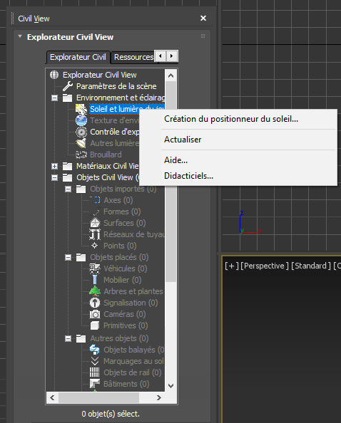 Civil View prend en charge la création et la gestion des objets Positionneur du soleil et Ciel physique.