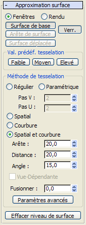 Permet de sélectionner un niveau d'approximation de surface prédéfini de basse, moyenne ou haute qualité. Lorsque vous choisissez un paramètre prédéfini, les valeurs utilisées apparaissent dans le panneau déroulant Méthode de tesselation.