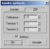 Distance en unités 3ds Max. Si la distance entre les arêtes des deux surfaces d'origine est inférieure à cette valeur, la concaténation supprime une ligne (ou une colonne) de points ou de CV afin d'éviter la création d'une ligne (ou d'une colonne) de points ou de CV communs dans la nouvelle surface zippée.