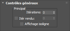 Remarque : l’onglet Contrôles généraux remplace les options Contrôles de maillage des versions antérieures d’OpenSubdiv. Il permet de masquer les itérations dans la fenêtre, tout en les utilisant dans le rendu. Cette option a toujours été disponible. Vous pouvez l’utiliser pour contrôler la topologie de maillage dans l’affichage et le rendu.