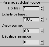 Ce nombre est réglé sur 1 par défaut mais vous pouvez sélectionner la valeur 0 si vous voulez animer le nombre de copies, en commençant sans aucune copie. La valeur Doubles est ignorée si vous distribuez les copies en utilisant les options Centres de face ou Sommets. Dans ce cas, une copie est placée à chaque sommet ou centre de face, selon votre sélection.