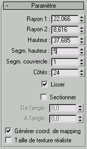 Si le rayon 1 est égal au rayon 2, le système génère un cylindre. Si les valeurs des rayons sont très proches, l'effet est similaire à l'application sur un cylindre du modificateur Effiler.