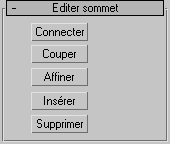 Possède une fonction identique à celle du bouton Insérer en mode de sélection sous-objet Sommet. Cette opération insère un ou plusieurs sommets, ce qui crée des segments supplémentaires. Lorsque vous déplacez le curseur sur un point Insérer valide, l'icône de la souris se transforme en icône Insérer. Cliquez avec le bouton droit de la souris pour arrêter l'insertion de sommets et de segments.