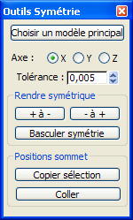 Cliquez sur ce bouton, puis sélectionnez l'objet sur lequel se base la géométrie. Le logiciel calcule ensuite la symétrie à partir de l'axe défini avec la valeur de tolérance indiquée (voir ci-dessous).