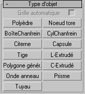 Outre les primitives standard, 3ds Max inclut un ensemble de primitives étendues. Vous pouvez créer les primitives à l'aide de la souris dans la fenêtre (voir la rubrique Création d'un objet) et la plupart d'entre elles peuvent également être générées à l'aide du clavier. Ces primitives sont affichées dans le panneau déroulant Type d'objet et le menu