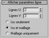 Cette option permet d'afficher dans toutes les fenêtres des représentations en lignes iso de la surface. Les lignes iso (paramétriques) sont similaires aux lignes de contour. Les lignes indiquent l'emplacement où la surface NURBS affiche une valeur U ou V constante, ou les deux. Les représentations en lignes iso sont moins surchargées et plus faciles à visualiser que les représentations de maillages filaires.