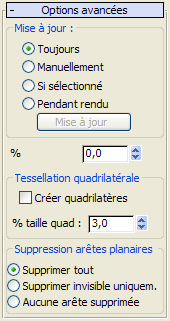 - (Créer quadrilatères) lorsque cette fonction est activée, modifie la tesselation de l’objet booléen de triangles en quadrilatères. Elles permettent d’éditer les surfaces de subdivision de l’objet et de lisser les maillages. Elles permettent également de convertir l’objet en format poly éditable.