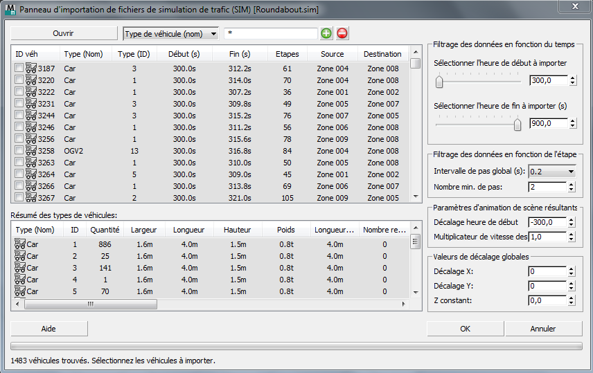 - Permet de décaler globalement l'heure de début de toutes les données d'animation de trafic importées. La valeur par défaut décale la valeur de l'heure de début générale à partir du fichier SIM, pour garantir que les données d'animation importées commencent à partir de l'image zéro sur la ligne de temps de 3ds Max.