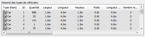 Répertorie les types de véhicule dans le fichier SIM, ainsi que le nombre total de véhicules (Quantité) détectés dans la catégorie de type de véhicule.