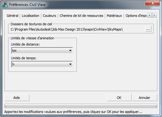 Ces paramètres sont stockés dans le fichier civilview.ini. Ce fichier est enregistré dans le répertoire \plugcfg (une copie de ce répertoire existe pour chaque langue utilisée par 3ds Max). Si le fichier INI est introuvable lorsque Civil View démarre, Civil View génère un nouveau fichier INI contenant des valeurs par défaut.