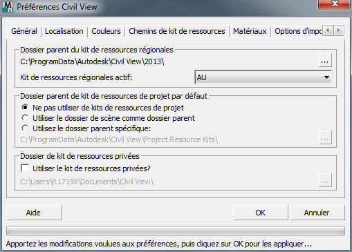 La modification de la sélection dans cette liste modifiera le contenu des bibliothèques de matériaux, des bibliothèques de styles et des bibliothèques d'objets Civil View actuellement chargées. La modification de la région active s'applique au prochain démarrage de Civil View.