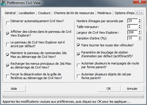 Lorsque cette option est activée, 3ds Max démarre Civil View au lancement de 3ds Max. Lorsqu'elle est désactivée, vous devez lancer Civil View explicitement dans chaque session 3ds Max l'aide des options Civil View Démarrer Civil View.