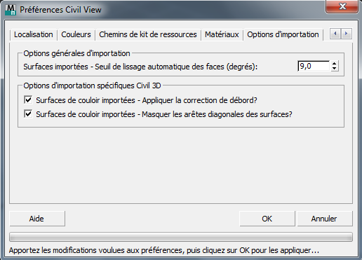 Les options d'importation sont utilisées par tous les groupes de fonctions Importation de Civil View.