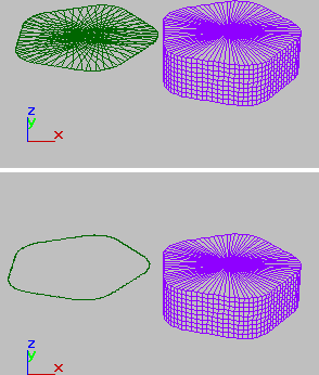 La forme résultante se compose d'une ou plusieurs splines, dont les sommets coïncident avec ceux des arêtes sélectionnées. L’option Lisser applique des valeurs de lissage aux sommets, tandis que l'option Linéaire produit des splines linéaires avec des sommets de coins.