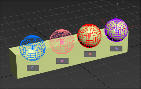 - La couleur filaire et du manipulateur de l’opérande change en fonction du type d’opération effectuée. Dans l’exemple suivant, chaque opérande est associé à une opération booléenne différente afin d’illustrer cette fonctionnalité : soustraire