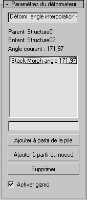 Ces paramètres s'appliquent au déformateur d'angle d'interpolation. Après avoir ajouté un gizmo d'interpolation, il est possible de créer des cibles d'interpolation en ajoutant un modificateur Editer maillage à la pile, au-dessus du modificateur Peau. Utilisez les commandes de sommet du modificateur Editer maillage pour ajuster la forme de la géométrie. Revenez ensuite au modificateur Peau dans la pile, puis cliquez sur Ajouter à partir de la pile. Le modificateur Editer maillage peut ensuite être supprimé. Avec la commande Ajouter à partir de la pile, vous pouvez vérifier le dernier modificateur de la pile avant d'obtenir la cible d'interpolation. A noter que l'effet d'interpolation est doublé dès que vous revenez au modificateur Peau. Pour rectifier cette anomalie, il suffit de supprimer ou de désactiver le modificateur Editer maillage.