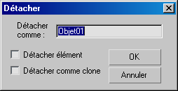 Par défaut, les options Détacher élément et Détacher comme clone sont désactivées. Ainsi, lorsque vous détachez une sélection de sous-objet, elle est retirée de l'objet d'origine et devient un nouvel objet. Les options de la boîte de dialogue vous permettent de garder l'élément détaché comme élément de l'objet d'origine et/ou de le détacher comme copie de la sélection d'origine.