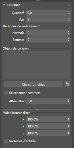 - Sélectionner sommets : lorsque cette option est activée, les sommets dont la quantité de poussée a été limitée par un objet de collision sont sélectionnés et transmis vers le haut de la pile.