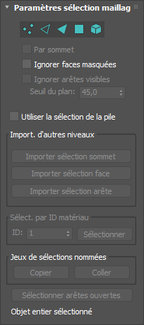 Ce modificateur permet de transmettre une sélection sous-objet aux modificateurs placés plus haut dans la pile. Il fournit un ensemble complet de fonctions de sélection disponibles dans le modificateur Éditer maillage. Vous pouvez sélectionner des sommets, des arêtes, des faces, des polygones ou des éléments, ainsi que changer la sélection pour passer du niveau de sous-objet au niveau de l'objet.