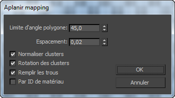 La méthode Aplanir mapping du mapping procédural applique des maps planaires aux groupes de polygones de texture contigus qui correspondent à un seuil d'angle spécifié. Elle empêche le chevauchement de clusters de mapping, mais peut provoquer une distorsion de la texture. La boîte de dialogue Aplatir correspondance vous permet de contrôler la façon dont les clusters sont définis et mappés.