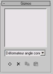 Les commandes du panneau déroulant Gizmo permettent de déformer le maillage selon l'angle de la connexion, ainsi que d'ajouter des gizmos à des points sélectionnés de l'objet. Ce panneau déroulant comporte une zone de liste répertoriant tous les gizmos du modificateur, une liste déroulante contenant les types de gizmos courants, ainsi que quatre boutons (Ajouter, Supprimer, Copier et Coller).