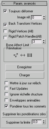 - Tous les poids de sommets inférieurs à la valeur du champ Supprimer la limite zéro sont supprimés. Ceci permet de limiter le poids du modèle avec peau (dans les jeux par exemple), car moins de données superflues sont conservées dans la géométrie. Cette option est également accessible à partir de la Table poids.