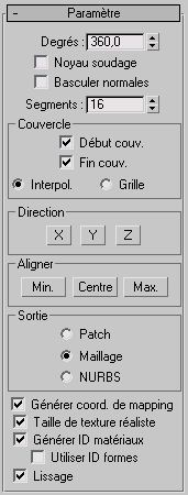 Utiliser ID formesUtilise les ID de matériau affectés aux segments d'une spline ou aux sous-objets courbe d'une courbe NURBS créés par révolution. Cette option n’est disponible que si l'option Générer ID matériaux est activée.