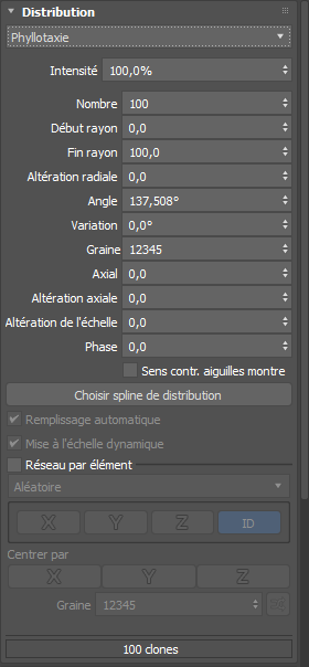 - Menu par défaut : effectuer une sélection > Menu Modificateurs > Déformations paramétriques > Réseau > Panneau déroulant Distribution > Phyllotaxie