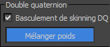- Dans la zone Double quaternion du panneau déroulant Paramètres, assurez-vous que la bascule du skinning DQ est activée, comme c’est le cas par défaut, puis cliquez sur Poids de mélange.