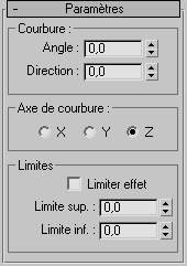 Spécifie l'axe à courber. A noter que cet axe est local au gizmo Courbure, non pas lié à l'entité sélectionnée. Valeur par défaut = Z.