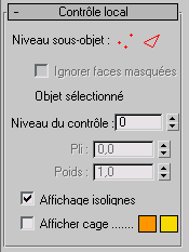 Permet de visualiser le maillage de contrôle après une ou plusieurs itérations, ainsi que de modifier les points et arêtes de sous-objets à ce niveau. Les commandes Transformation et le paramètre Poids sont disponibles pour tous les sous-objets et à tous les niveaux. Le paramètre Pli est uniquement disponible au niveau de sous-objet Arête.