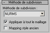 Cette zone permet de définir des options de mise à jour manuelles ou de rendu pour les situations où la complexité de l'objet lissé est trop élevée pour une mise à jour automatique. Vous remarquerez en outre qu'il est possible, sur le panneau déroulant Quantité subdivision, de définir une grande quantité de lissage à appliquer uniquement lors du rendu.