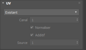 - Définit le canal de la texture UV source lorsque la méthode UV est définie sur Additif.